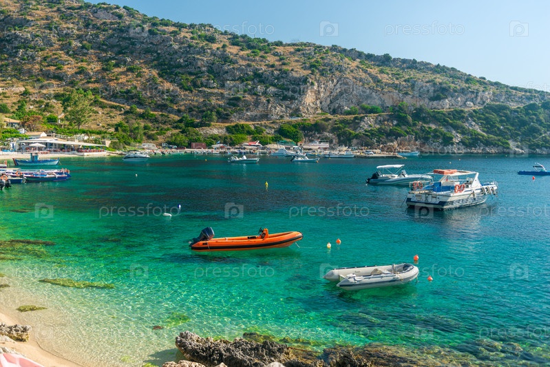 Лодки качаются на бирюзовых волнах Ионического моря Греции в солнечную погоду