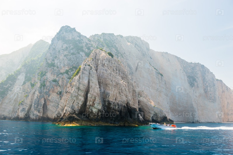 Скалистое побережье греческого острова и вид на море, пейзаж греции вид с лодки