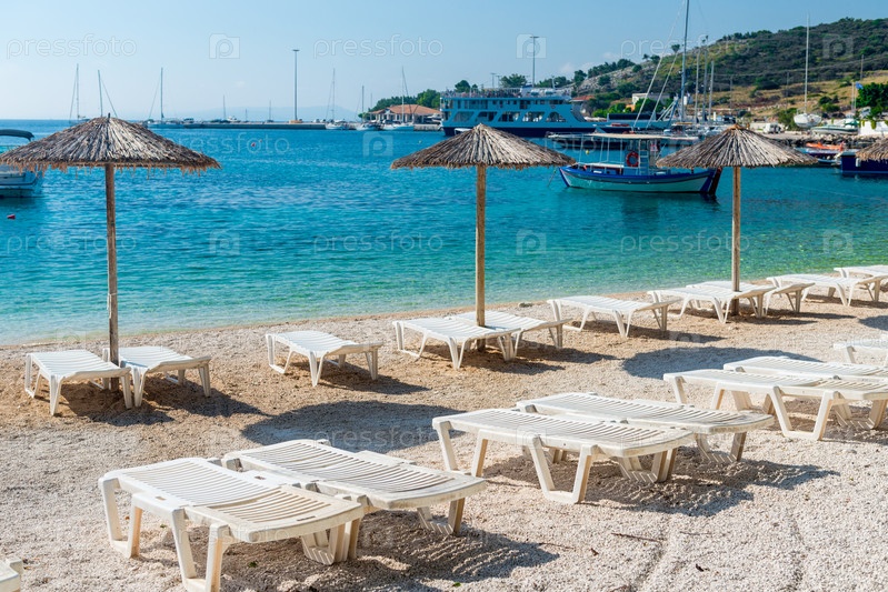 Место для летнего отдыха. Соломенные зонтики и шезлонги на пустом пляже с морем на заднем плане