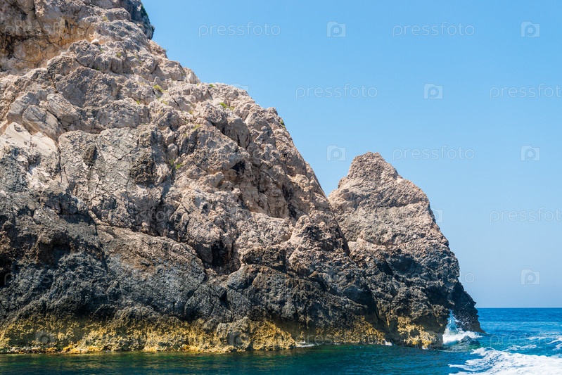 Скалистое побережье греческого острова и вид на море, пейзаж греции вид с лодки