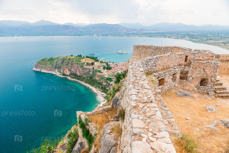 Панорамный вид на крепость Паламиди, пейзажи замка Бурдзи в городе Нафплион Греция, Пелопоннес