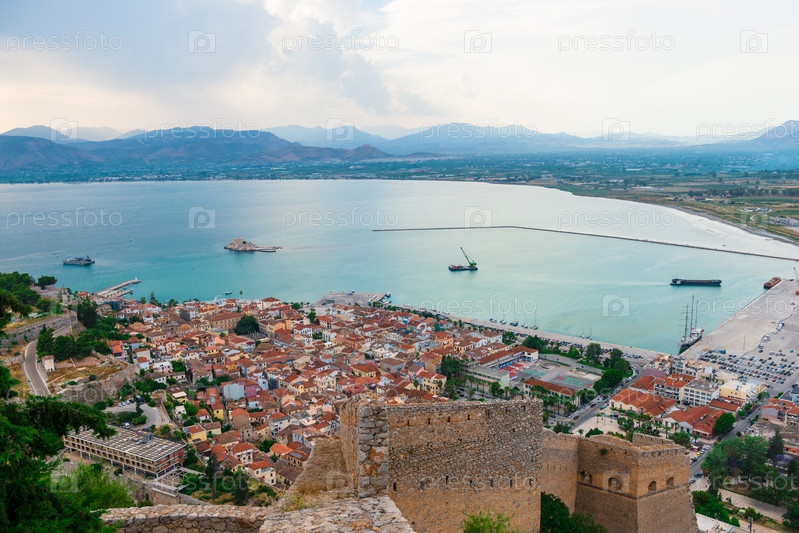 Панорамный вид на крепость Паламиди, пейзажи замка Бурдзи в городе Нафплион Греция, Пелопоннес