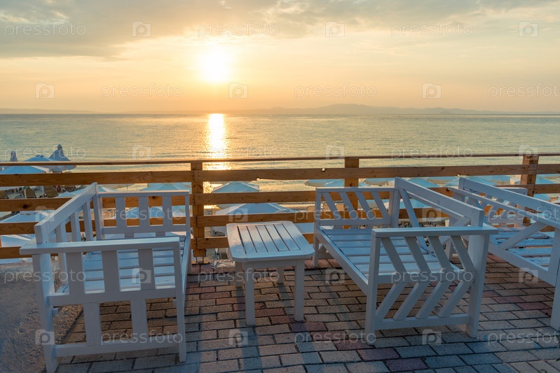 Ассортимент деревянного стола и белого стула для отдыха в ресторане у моря