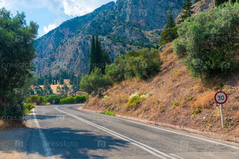Шоссе в горах, скалы с обеих сторон с горами на заднем плане, Греция