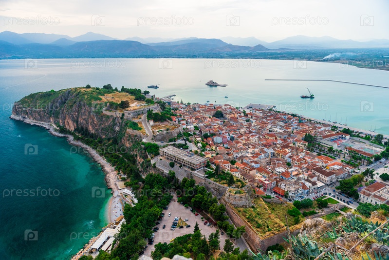 Панорамный вид на крепость Паламиди, пейзажи замка Бурдзи в городе Нафплион Греция, Пелопоннес