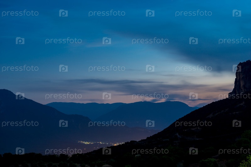 Закат над горами. Синее небо с бликами света над цепью скалистых гор