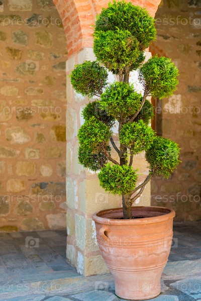 Маленькое декоративное подстриженное дерево в горшке на улице Греции