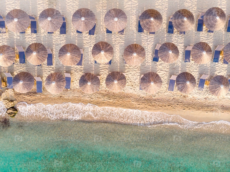 Вид с воздуха на песчаный пляж и бирюзовое море, с зонтиками и шезлонгами в прекрасный солнечный летний день