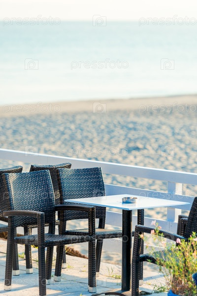 Ассортимент деревянного стола и черного стула для отдыха в ресторане у моря