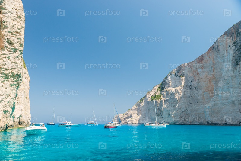 Красивое морское побережье с бирюзовой водой, яхтой и скалами