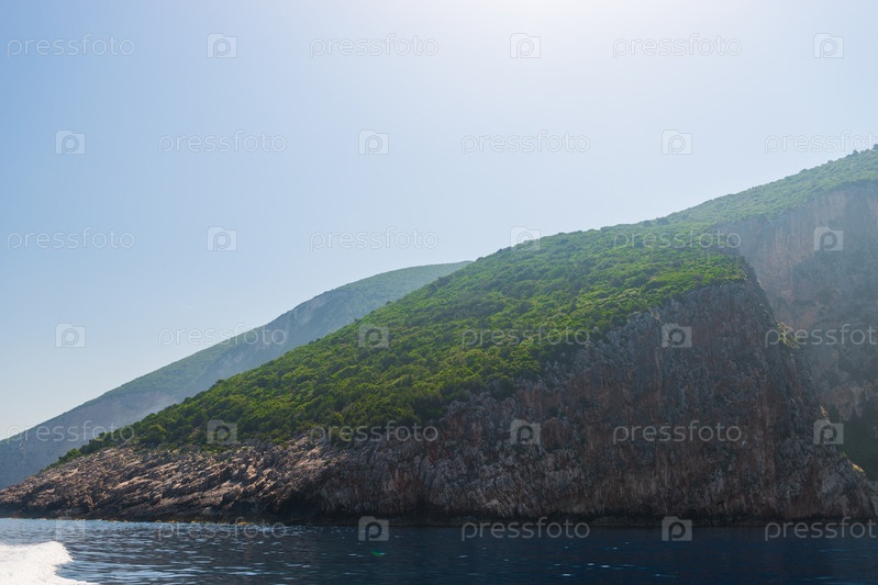 Скалистое побережье греческого острова и вид на море, пейзаж греции вид с лодки