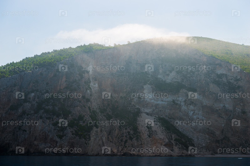 Скалистое побережье греческого острова и вид на море, пейзаж греции вид с лодки