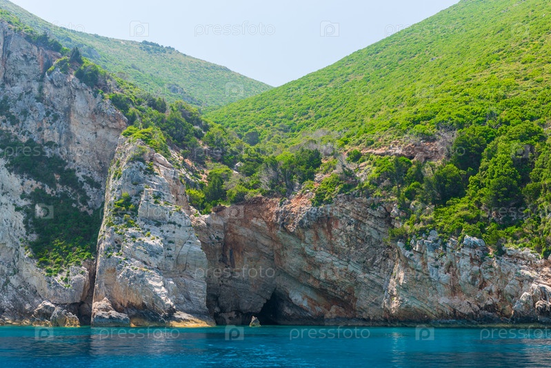 Скалистое побережье греческого острова и вид на море, пейзаж греции вид с лодки
