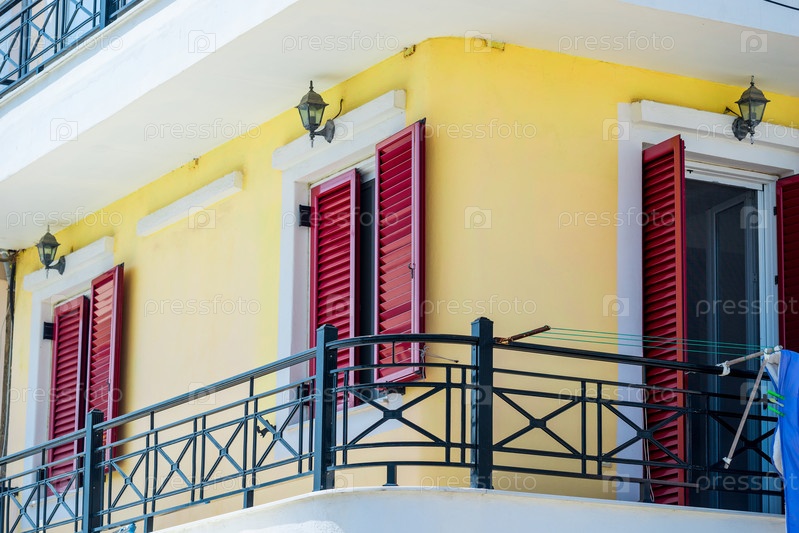 Старые средиземноморские красные ставни и фон здания