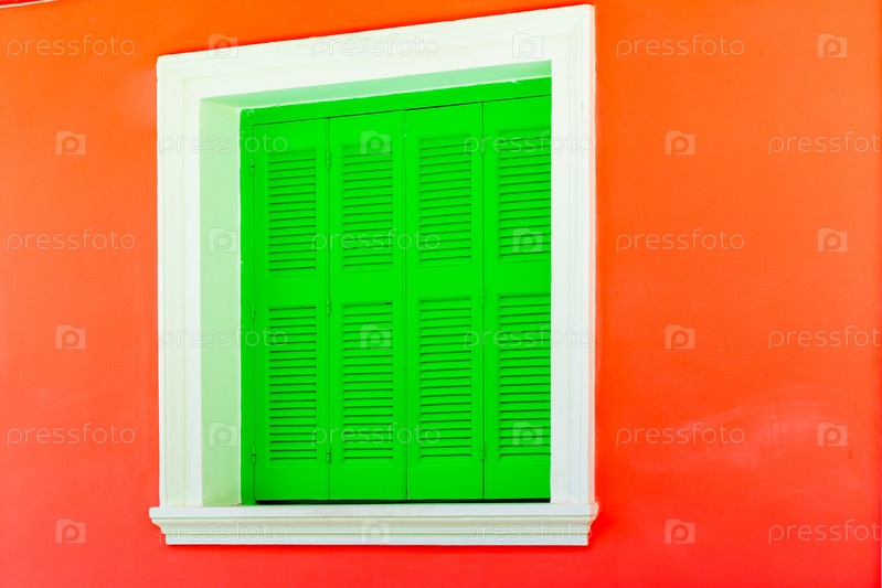 Зеленые закрытые ставни на окнах и красная стена крупным планом