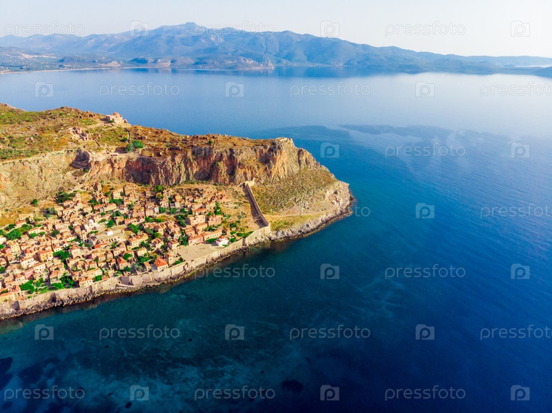 Вид сверху на укрепленную греческую деревню на скалистом острове Монемвасия, Пелопоннес, Греция