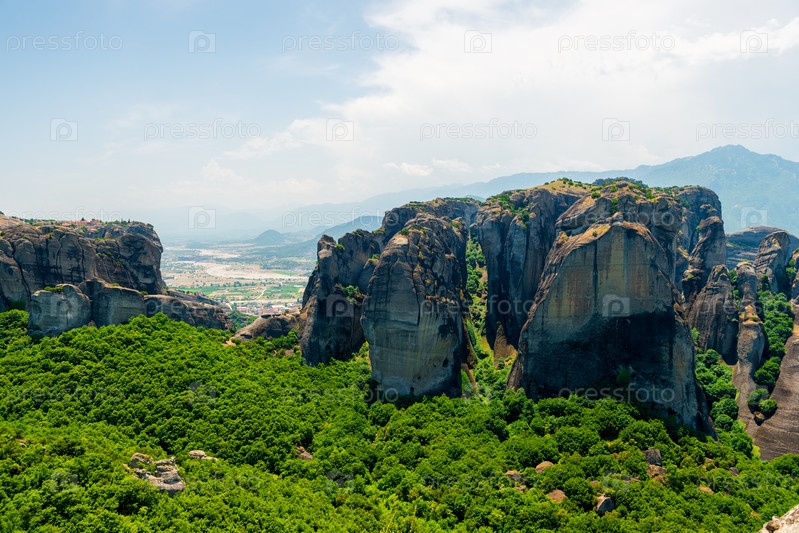 Огромные серые метеоры утесов в Греции среди зеленого горного леса
