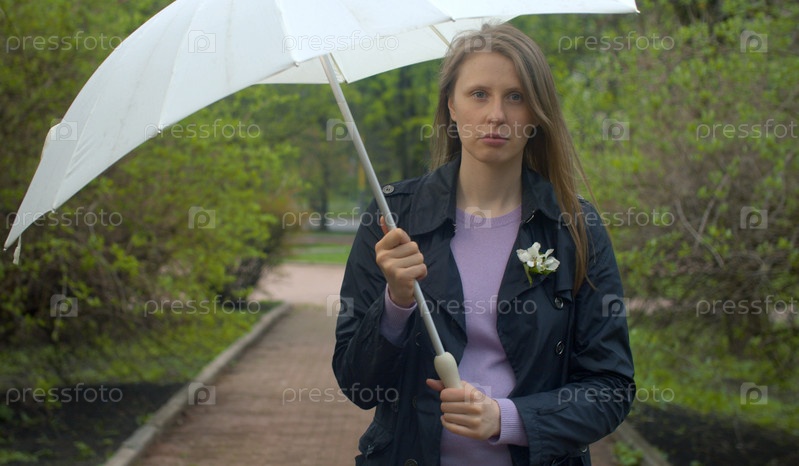 Дождливый день в парке. Привлекательная женщина, идущая с зонтиком под дождем. Женский портрет на открытом воздухе. Настоящие люди