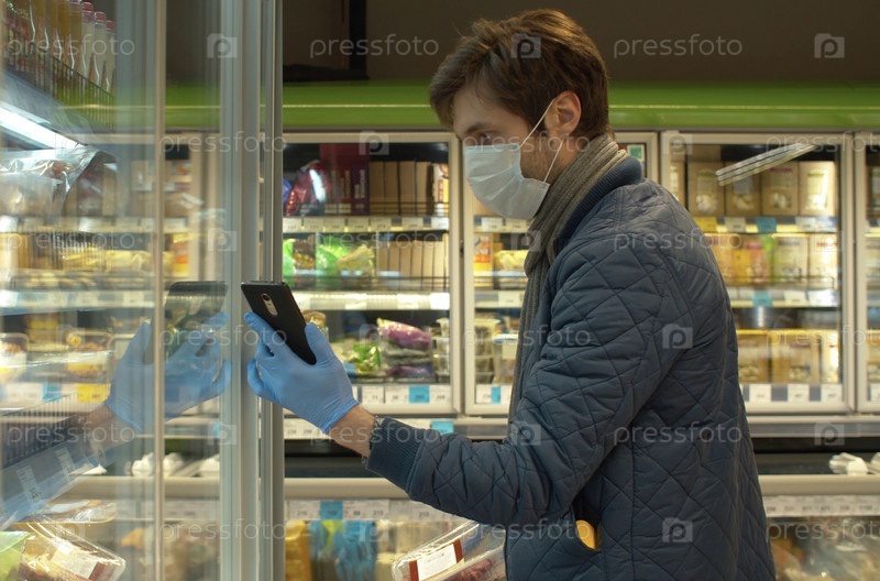 Молодой красивый мужчина в защитной маске и перчатках в супермаркете. Берет продукты из холодильника. Эпидемия коронавируса в городе