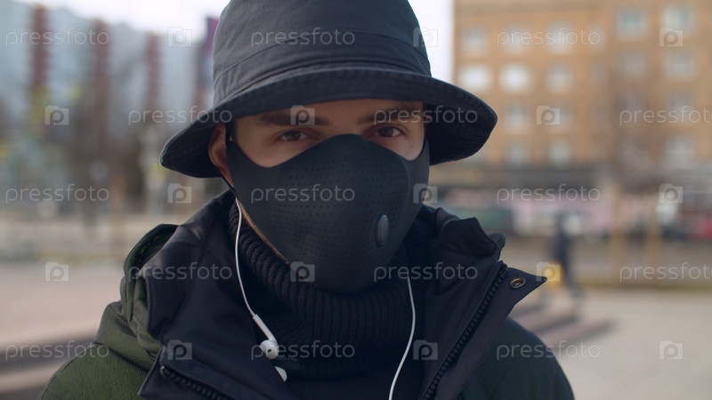 Большой план портрета молодого человека в многоразовой защитной маске на улице Эпидемия коронавируса в Москве Концепция здоровья и безопасности жизни Пандемия COVID-19