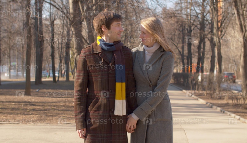 Красивая влюбленная пара гуляет в парке