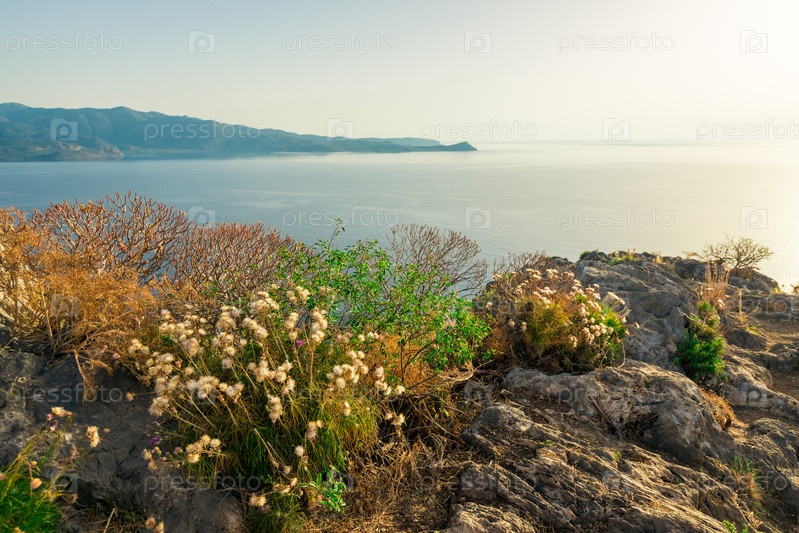 Скалистое побережье греческого острова и вид на море, пейзаж греции