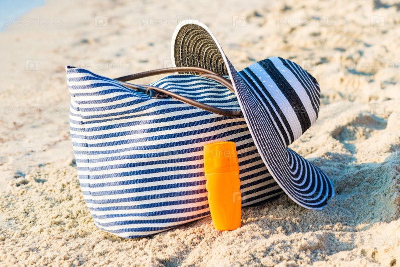 Лосьон для загара, шляпа с сумкой на тропическом пляже