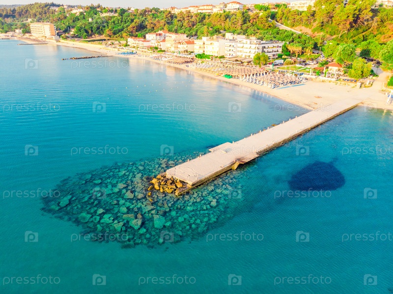 Вид сверху на бирюзовое море, песчаный пляж и пирс