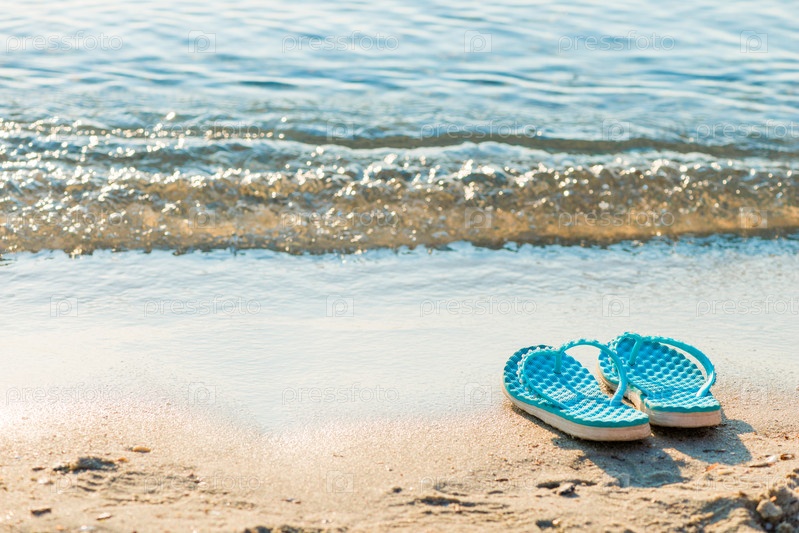 Синие шлепанцы на песчаном пляже. Концепция летних каникул