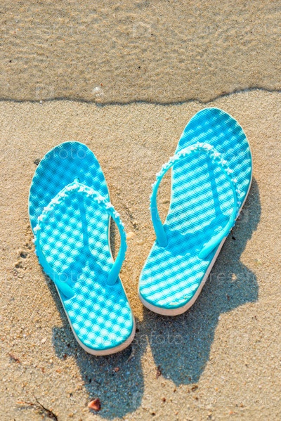 Синие шлепанцы на песчаном пляже. Концепция летних каникул