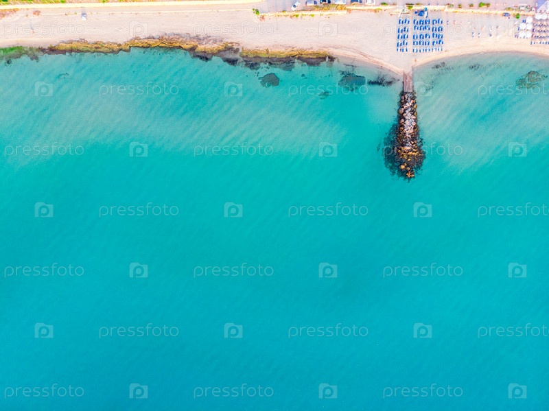 Вид сверху на бирюзовое море, песчаный пляж и пирс