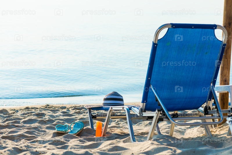 Полосатая шляпа лежит на краю шезлонга, на берегу моря с прекрасным видом