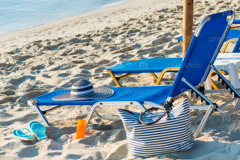 Стул и пляжные аксессуары у моря. Летний отпуск