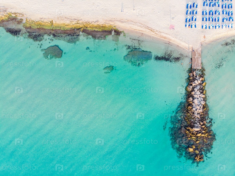 Вид сверху на бирюзовое море, песчаный пляж и пирс