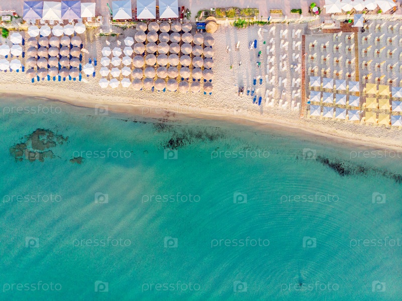 Вид с воздуха на песчаный пляж и бирюзовое море, с зонтиками и шезлонгами в прекрасный солнечный летний день