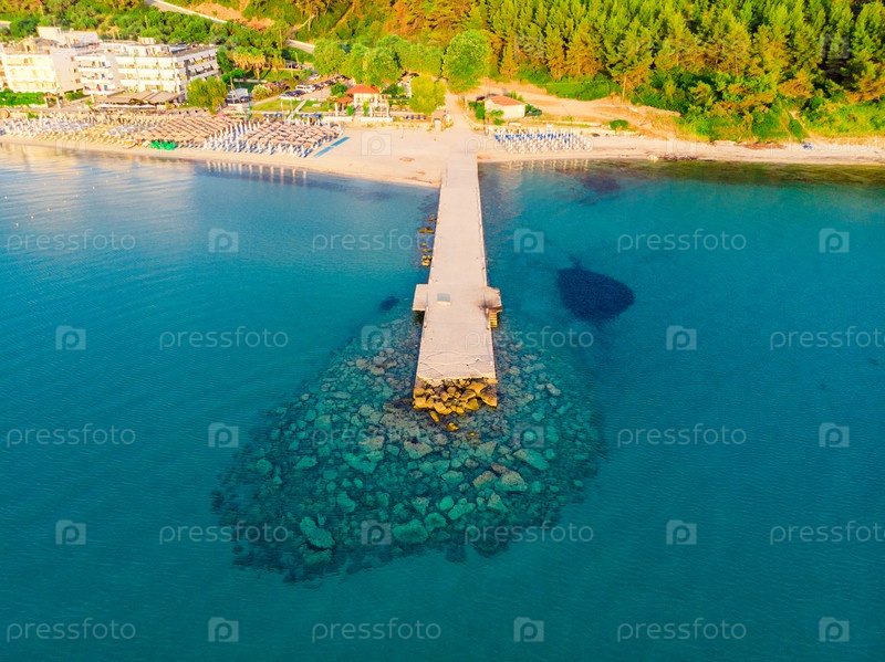 Вид сверху на бирюзовое море, песчаный пляж и пирс