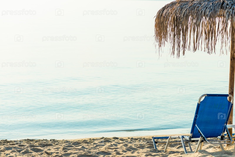 Пляжные зонтики и шезлонги на пляже на идиллическом тропическом курорте для летних каникул