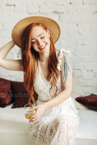 Счастливая молодая женщина в платье бохо и шляпе, наслаждаясь вином с улыбкой