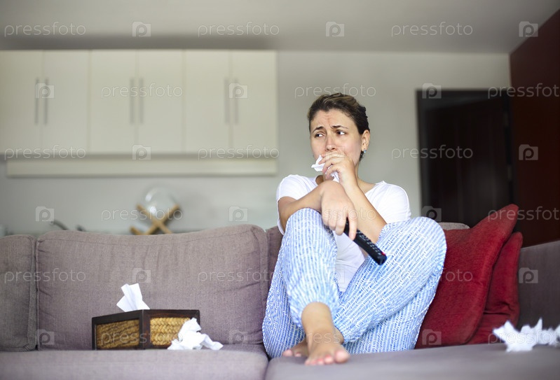 Грустная женщина сидит на диване и смотрит телевизор дома
