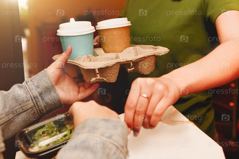 Доставщица пиццы дает картонную коробку покупательнице на пороге