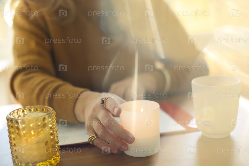 Размытое изображение ароматической свечи женщины с молнией во время удаленной работы дома