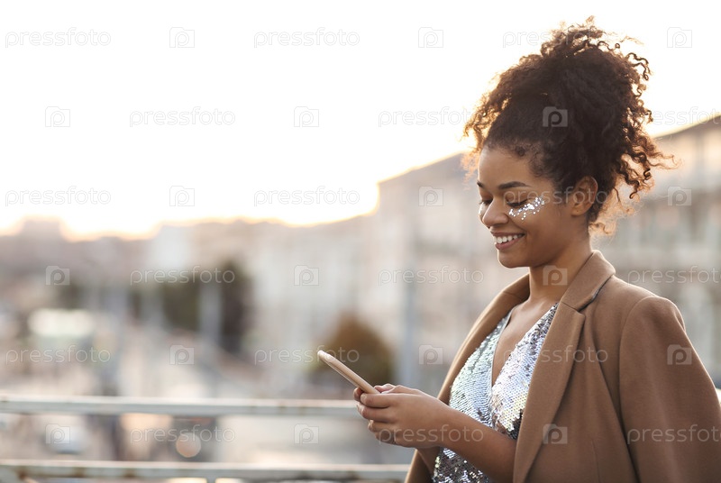 Счастливая африканская американка в вечернем платье с блестками и блестками на лице с помощью мобильного телефона