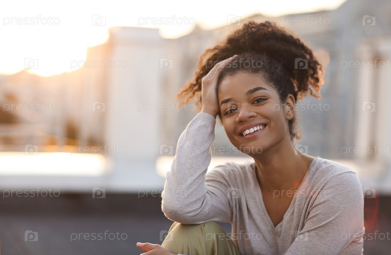 Молодая счастливая африканская американка смотрит в камеру, сидя на террасе на крыше солнечным утром
