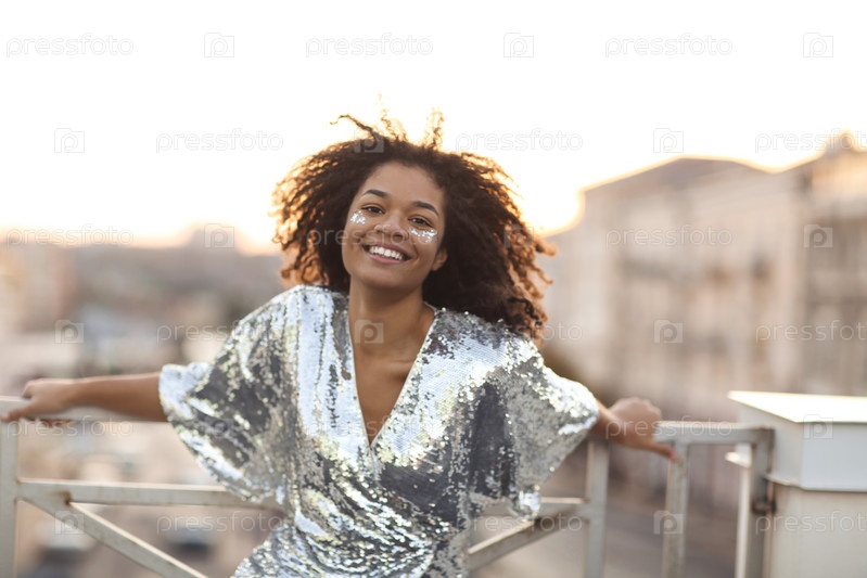 Молодая счастливая гламурная африканская американка с блестками на лице, стоящая на террасе на крыше на открытом воздухе