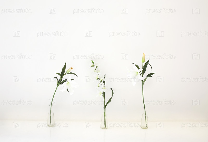 Красивые натуральные лилии в стеклянных вазах на фоне белой стены