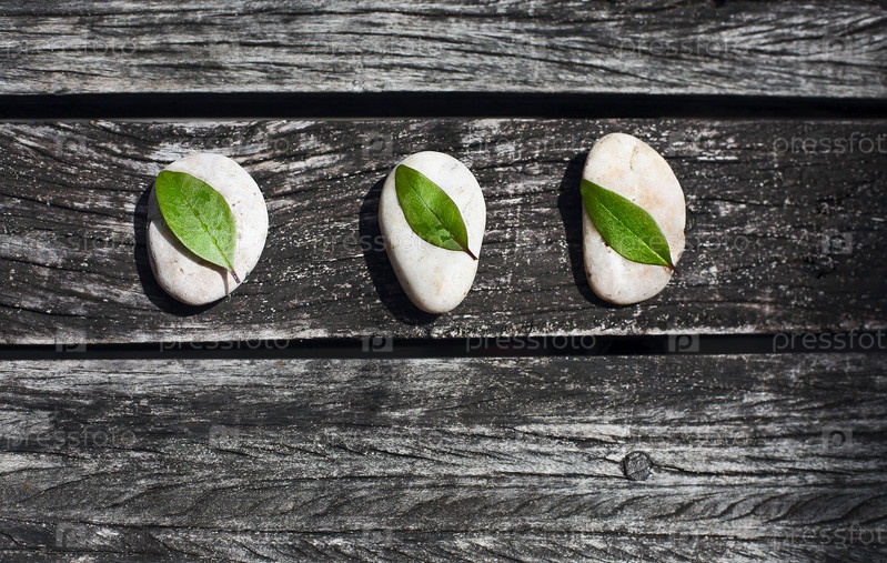 Дзен деревянный фон с серыми камнями и зелеными листьями
