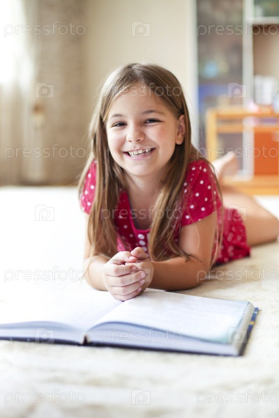 Маленькая девочка читает книги дома