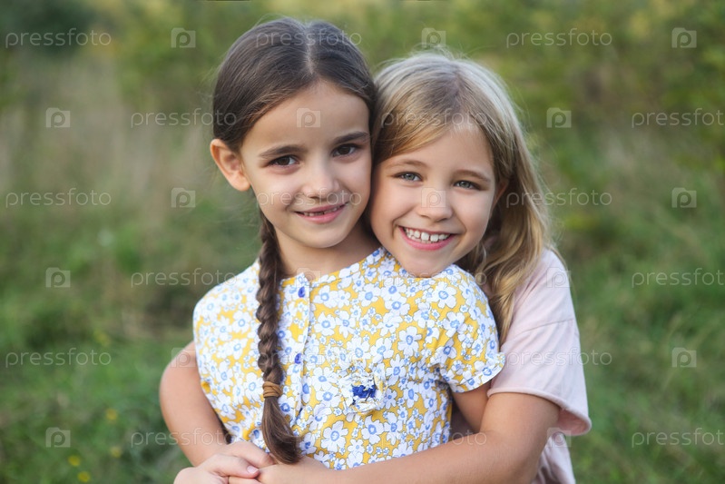 Портрет счастливых блондинок и темноволосых сестер, смеющихся и обнимающихся