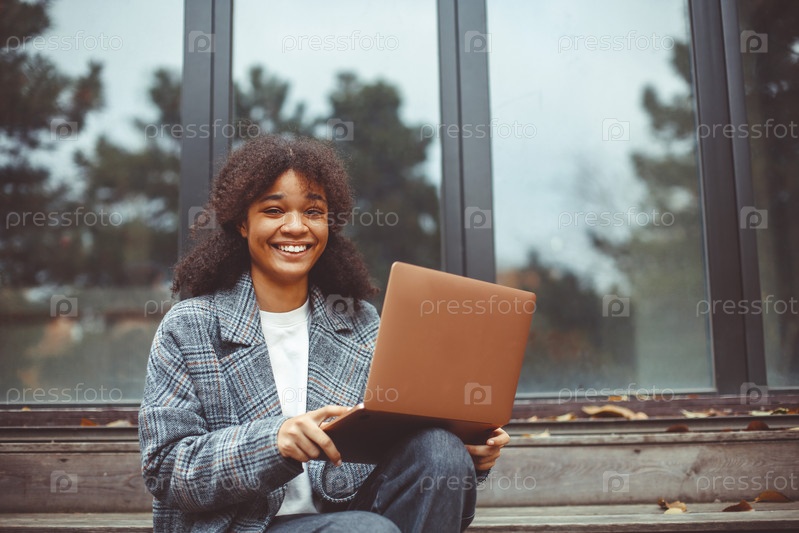 Открытый осенний портрет молодой веселой африканской американки с ноутбуком