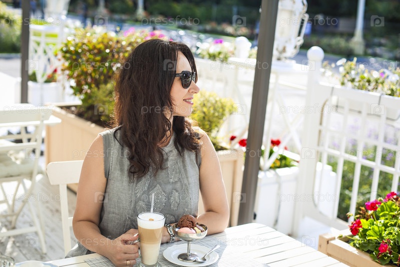Женщина пьет кофе латте и ест мороженое в уличном кафе